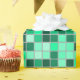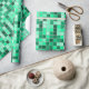 This design features a pattern with a grid of square-shaped tiles coloured various shades of green and teal.