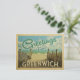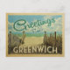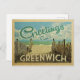 This Greetings From Greenwich vintage postcard design features a sandy beach with a beautiful turquoise ocean water and above the sea, a blue sky with billowy white clouds. In vintage travels style.