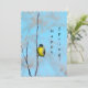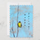 Yellow breasted finch with black head is grasping a vertical branch. Front text reads "Happy Spring!" on back, "Enjoy the World around you!" (both may be changed). Background of blue sky and blurred tree branches.