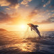 Leaping from the cool waters, this playful dolphin rejoices in the early sunshine as the sun rises in this magnificent seascape.