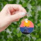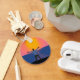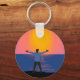 Greeting to the Sun. A man is standing on a beach facing towards the open sea and saluting the yellow sun with raised arms.