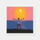Greeting to the Sun. A man is standing on a beach facing towards the open sea and saluting the yellow sun with raised arms.