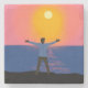 Greeting to the Sun. A man is standing on a beach facing towards the open sea and saluting the yellow sun with raised arms.