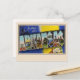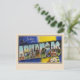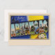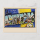 This vintage postcard reproduction features large letters filled with iconic images of Arkansas