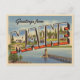 This is a classic vintage-style postcard design featuring the phrase "Greetings from Maine." The large, stylised letters of MAINE each contain a unique scene or landmark from the state, including lighthouses, coastal landscapes, and historical homes, with an additional prominent lighthouse and bridge in the foreground. The design has a nostalgic, mid-century feel with its retro colour palette and bold font, making it perfect for products like postcards, posters, and t-shirts for anyone who loves vintage travel art or the beautiful state of Maine.