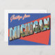 This beautiful postcard features a classic "Greetings from Michigan" large letter design with a nostalgic, retro feel. Each letter of "MICHIGAN" is filled with a unique scene from the Great Lakes State, showcasing iconic landmarks like the majestic Mackinac Bridge, the stunning shoreline of Pictured Rocks National Lakeshore, and the immense Sleeping Bear Dunes. The vintage colour palette and striped background add to its old-fashioned charm, making it a perfect keepsake or a thoughtful note to send to friends and family. Ideal for travelers, postcard collectors, or anyone who loves the natural beauty and vibrant spirit of Michigan.