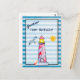 A postcard which says: Greetings from Nantuckets. Set on a blue striped background. Layered over top on a transparent white background is a red striped lighthouse and a beach ball. A smiling sun and flying seagull off in the distance.