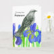 A "Greetings from Tennessee decorated with a mockingbird in a bed of bright royal blue iris flowers drawn with ink and painted with watercolor. Inspired by the state bird and state flower of Tennessee. You can edit or remove the text to fit your needs.