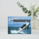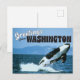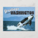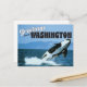 Greetings from the state of Washington with a photo of a jumping Orca whale with coastline mountains in the background, and Greetings from Washington in vintage style fonts.