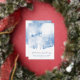 Below the sky, snow drifts cradle a peaceful landscape of blue and white fir trees, creating a serene holiday moment. The phrase “From our family to yours” is fully customisable, followed by editable fields for family member names and the year—making this card a heartfelt keepsake for loved ones near and far.