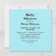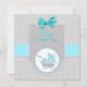 Stylish square baby shower invitation done in aqua blue, with custom grey text ready to personalise. The back of the invitation is done in a light grey and white polka dot pattern, with sweet graphics of a aqua blue baby pram and a bright aqua blue satin looking bow. Personalise the dark grey text, for your baby shower.