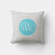This pillow has a grey chevron pattern in the background with a blue circle and a three letter monogram in the centre.