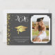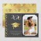 This modern design features a graduation hat and confetti in gold on a background of grey with white text.