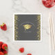 This modern design features a graduation hat and confetti in gold on a background of grey with white text.