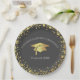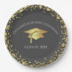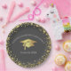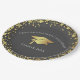 This modern design features a graduation hat and confetti in gold on a background of grey with white text.