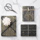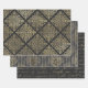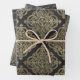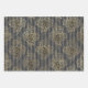 Vintage Paris grey and gold pattern wrapping paper in three different styles including grapes, ironwork, and antique calligraphy.