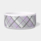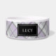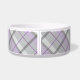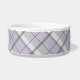 This pet bowl has a stylish tartan / plaid style pattern in grey and purple colour scheme. There is also a black banner with a customisable text area for pet's name.