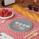 Salmon pink and grey 40th FOUROH! photos birthday party plate. Graphic fortieth birthday plate that can be personalised with your own name and four photos of your forty year old birthday girl. Ideal to add a photo from each decade! Unique design by www.mylittleeden.com