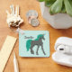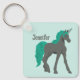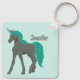 Features a unicorn illustration in a realistic style. The unicorn is a dark charcoal grey with a teal green mane and tail. There’s a spot to add a name or other text in grey lettering. The text and graphic appear on both sides of this keychain.