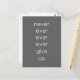 This simple yet sophisticated postcard provides great words of advice and inspiration. The postcard reads, “never ever ever ever give up”. This postcard has a grey background and the text is printed in a clean, white sans serif font. These are great gifts of inspiration to those struggling with illnesses, or hard times. These are also great for general correspondence. I have also seen these motivational cards framed and displayed on office walls and desks. Give as a gift, or keep for yourself. How you want to use it is entirely up to you! Zazzle postcards are great quality, and extremely affordable. The postcard measures 5.6" x 4.25" inches on high quality cardstock paper. Please send me a message if you have any questions or concerns regarding the design.