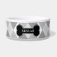 Argyle type pattern in grey colour scheme. There is also a black dog bone shaped banner with a personalizable text area for a name or other custom text such as "food", "dinner" or "water".