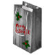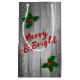 Christmas gift bag with grey wooden planks, holly berries with leaves, and typography saying "Merry & Bright".