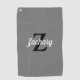 This personalised golf towel features a black monogram initial and white retro script name on a grey background.
