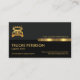 Overleaf, the same design theme is used. The upper layer has the gold logo with your prestigious name riding the gold stripe line. The black column underneath has the contact details and the slogan.