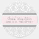 Baby shower thank you favour tag sticker in elegant light pastel blush pink, grey and white classic floral damask pattern. Customisable with your own text, contact us for a colour change. The perfect way to decorate your baby shower favours and thank your guests for being a part of your special day.