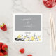 Grey branch with yellow flowers and names wedding paper napkin. The upper part is covered with an ultimate grey band and your names in script typography while the bottom part is of white colour with a grey and black branch with illuminating yellow flowers.