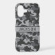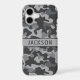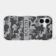 Customise this grey camouflage iPhone 17 case with your name in a trendy modern CAP font in dark grey on light grey. It's masculine and perfect for your favourite military, hunting, country or outdoorsman!