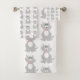 Bath towel set, consisting of a face cloth, hand towel and bath towel with a grey cat design. You can customise this bath towel set with any text of your choice. Should you require any help with customising then contact us through the message link on this page. Grey cat design bathroom towel set