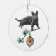 An grey kitten holds an evergreen bough with a vintage glass ornament dangling from it on this distinctive Christmas ornament. Customise by adding your own words.