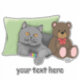 Cute grey British shorthair cat sitting with a cat toy and a teddy bear. The cat is hoping their previous mischief they got into is blamed on the dog.
