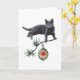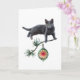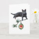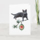 An grey kitten holds an evergreen bough with a vintage glass ornament dangling from it on this distinctive Christmas card.