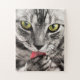 Grey Cat with Yellow Eyes Licking Paw Jigsaw Puzzle