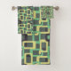 This towel set has a mid-century modern design of rounded rectangles with ovals inside in retro shades of dark grey, pale yellow, and seafoam on a field of light grey. If you want the same design with different colours, message me.