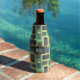 This bottle cooler has a mid-century modern design of rounded rectangles with ovals inside in retro shades of dark grey, pale yellow, and seafoam on a field of light grey. If you want the same design with different colours, message me.
