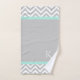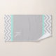 Stylish bath towel set featuring a grey and white chevron pattern on the bath towel. The hand towel is done in light grey, with a grey and white chevron pattern on either end, with a mint green and white polka dot ribbon accent. The wash cloth is done in a solid mint green. Personalise the white one letter monogram, on the hand towel to suit your needs.