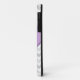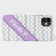 Stylish and girly chevron iPhone 5 case designed with a pattern of 2 shades of grey and white zigzags, and personalised with your name or custom text diagonally in white over a purple stripe.
