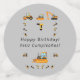 Grey Confetti for a boy birthday party, bilingual and customisable with your own language. Text says: "Que aproveche", "Salud", "Feliz cumpleaños" in Spanish and "Enjoy your meal", Cheers" and "Happy Birthday" in English.