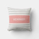 Elegant and modern nautical style Throw Pillows or cushions with a simple, modern and stylish striped pattern design that is custom monogrammed with your name in a preppy font. Grey and white vertical stripes contrasted with a Coral pink colour block background. Personalise your gift by adding your own name or initial. Choose your own font and colours to make it your own. This trendy design will make a great gift for yourself or someone special and will enhance any home, office, boat or dorm.