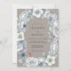 This enchanting design features a soft grey palette accented with cool-toned blues and delicate white blossoms. A graceful arch of crystals and ethereal florals evokes a romantic, whimsical mood, perfect for a magical union. The artwork showcases roses, thistle-like blooms, and subtle hints of coral.