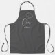 Custom chef apron feature cute chef script and hat with personalised name on grey background. Great personalised chef apron.