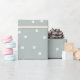 White polka dots with smaller bright green dots nestled inside, all on a grey background