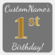 This simple birthday sticker design features a message like "CustomName’s 1st Birthday!", with the "1st" having a faux/imitation gold-inspired colour appearance, on a grey (grey) coloured background. The name can be personalised. Stickers like these could perhaps be a gift for somebody who is celebrating their first birthday, or they could perhaps be used as decorations at a birthday party. [~Z0000250]