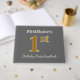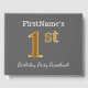 This guest book design features the ordinal number "1st" with a faux/imitation gold-like appearance. It also features a customised name, and a grey (grey) coloured background. It could be used at a birthday party for somebody who is celebrating their first birthday. [~Z0000193]