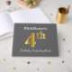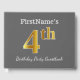 This guest book design features the ordinal number "4th" with a faux/imitation gold-like appearance. It also features a personalised name, and a grey (grey) coloured background. It could be used at a birthday party for somebody who is celebrating their fourth birthday. [~Z0000193]