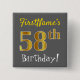This simple square button design features a message like "FirstName’s 58th Birthday!", with the "58th" having a faux/imitation gold-like colouring look, on a grey (grey) coloured background. The name can be personalised. Buttons like these could perhaps be worn by guests at a birthday party for somebody who is celebrating their fifty eighth birthday, where the party is being held in a large area with lots of other people present (such as a city park or a theme park). [~Z0000192]