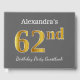 This guest book design features the ordinal number "62nd" with a faux/imitation gold-like appearance. It also features a personalised name, and a grey (grey) coloured background. It could be used at a birthday party for somebody who is celebrating their sixty second birthday. [~Z0000193]
